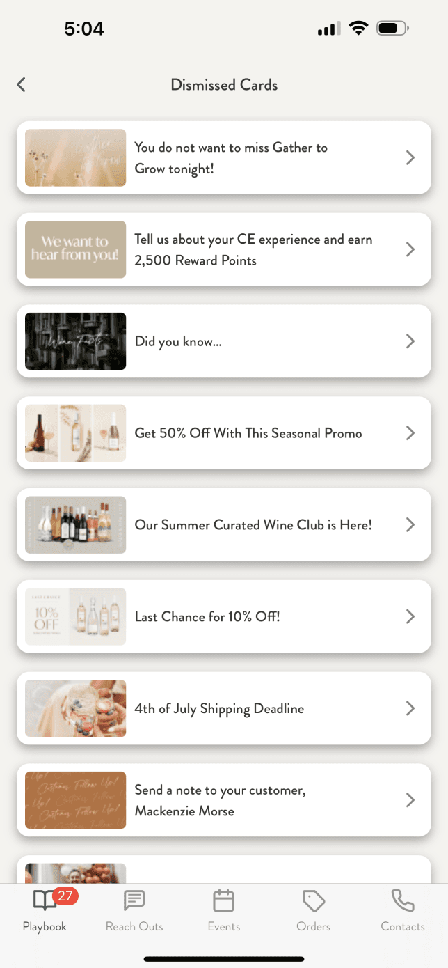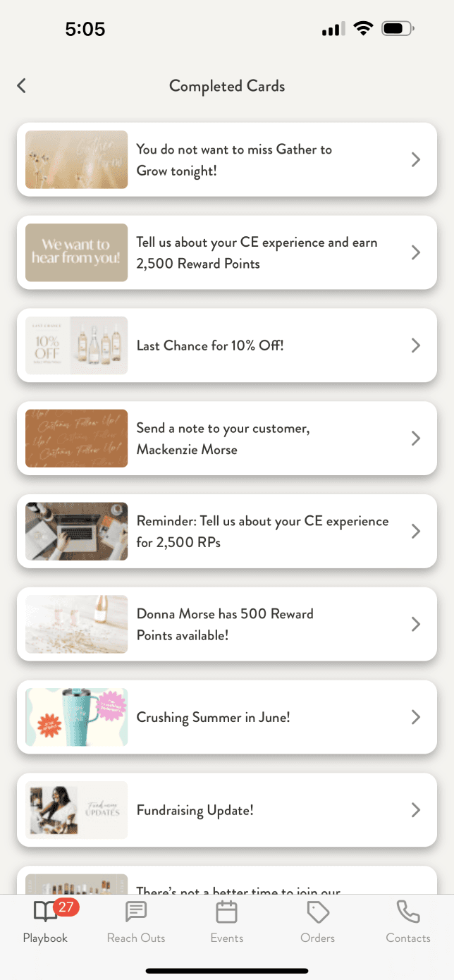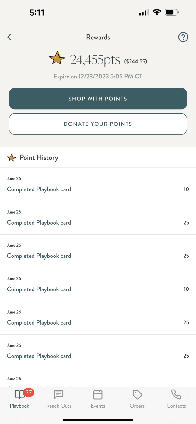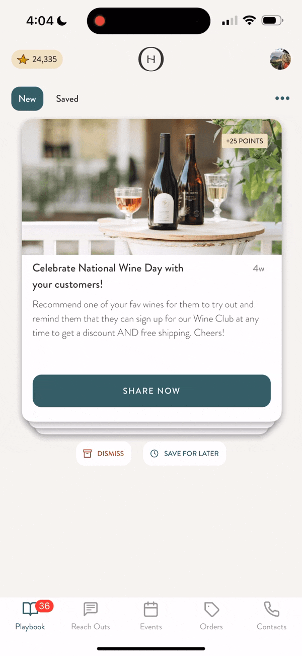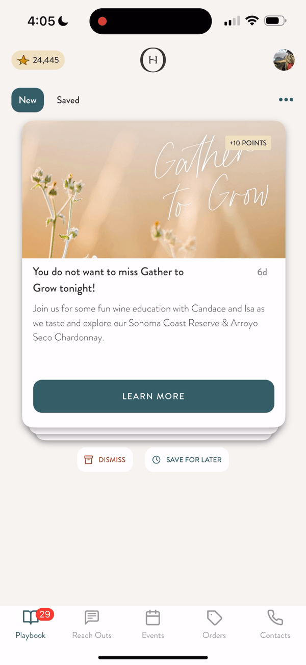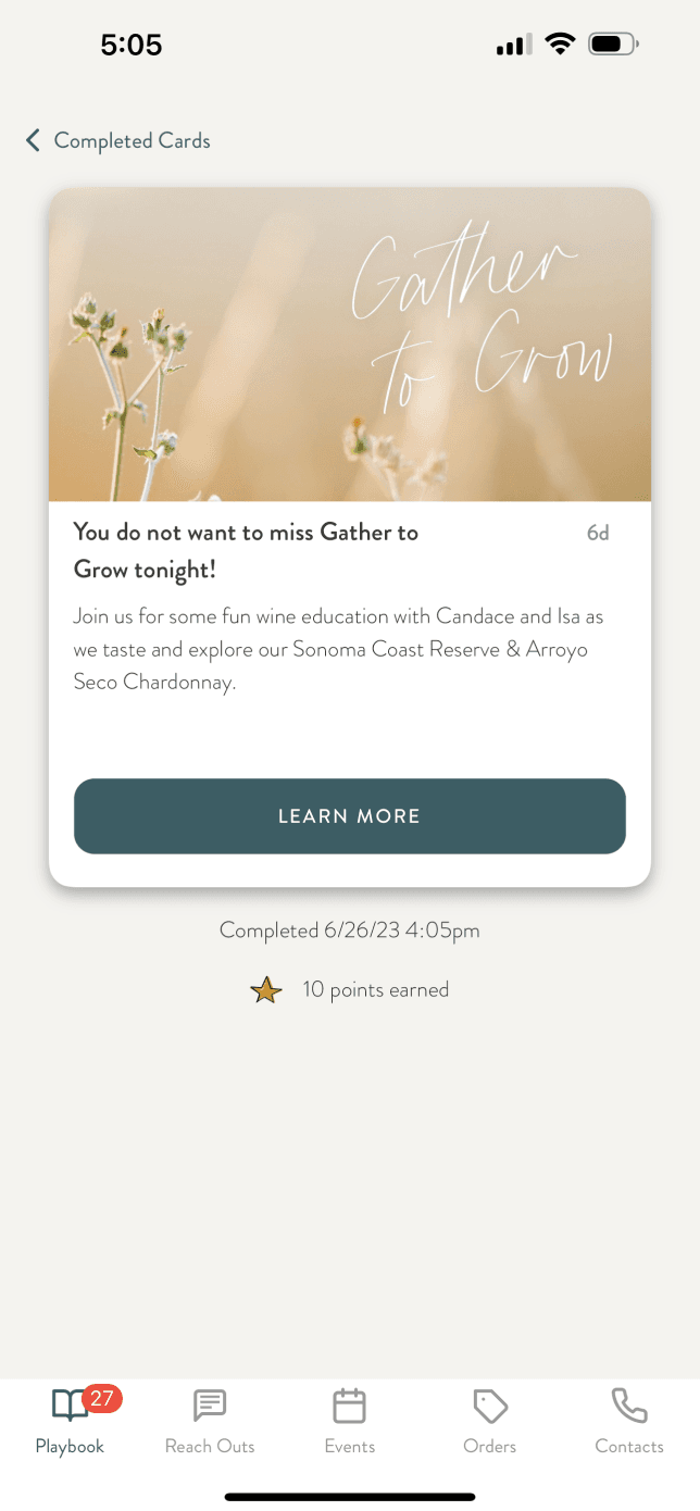 We gamified the experience to motivate users to complete Playbook cards. Rewards points can be redeemed for wine or donated to a cause.